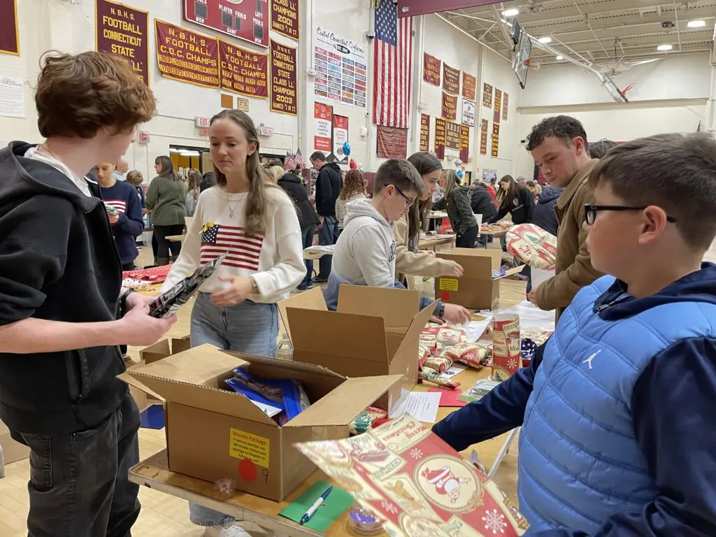 In the gymnasium of New Britain High School, they joined hundreds of other people from throughout Central Connecticut in wrapping and packing food gifts for military members in time for the Christmas holiday.