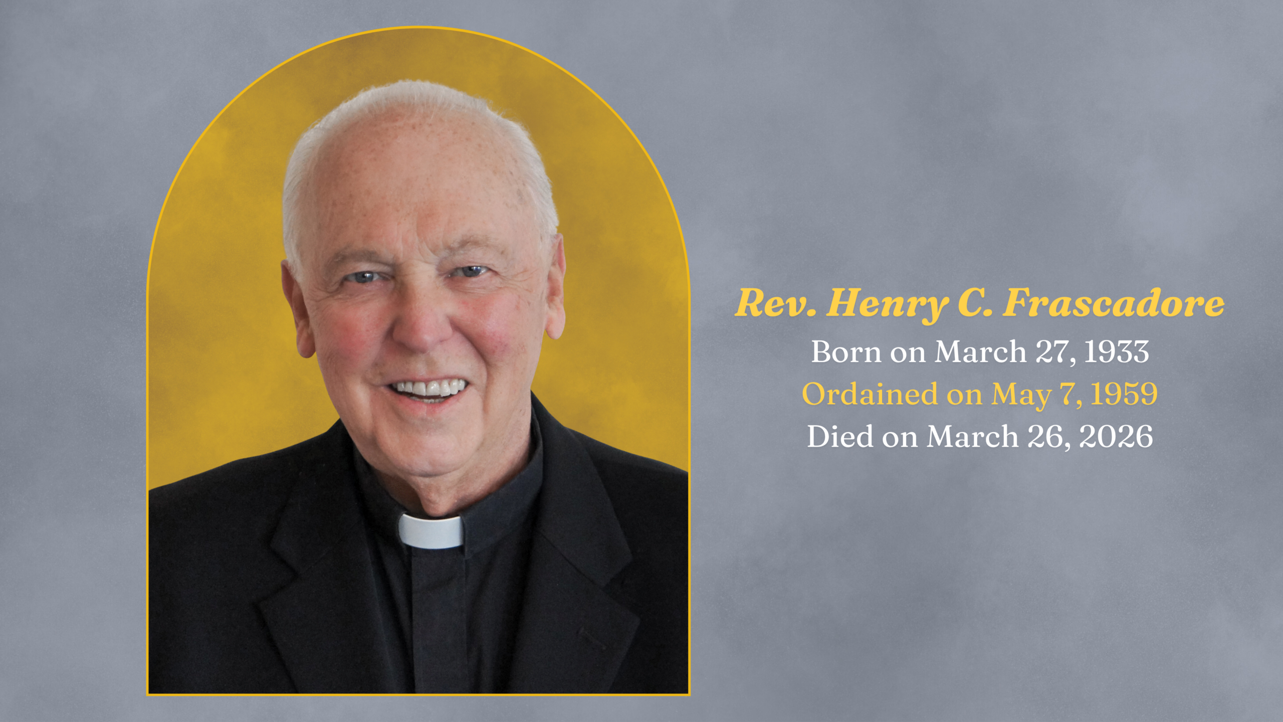 Rev. Henry C. Frascadore died yesterday at the age of 92, just one day shy of his 93rd birthday. He was ordained a priest on May 7, 1959. Funeral arrangements, which will be held after Easter Sunday, have not yet been determined but will be added to this post.