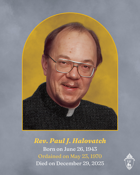 The Reverend Paul J. Halovatch, ordained May 23, 1970, died December 29th at the age of 82. Mass of Christian Burial is scheduled for Monday, January 5th at 11:00 am at Our Lady of Fatima Church, Yalesville (St. Benedict of Nursia Parish). Burial will be private.